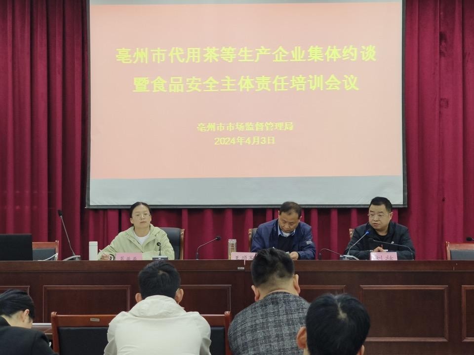 中國食品安全網(wǎng)訊(葛燕燕 記者程家武) 2024年4月3日,亳州市市場監(jiān)管局組織召開代用茶等生產(chǎn)企業(yè)集體約談暨食品安全主體責(zé)任培訓(xùn)會議,市市場監(jiān)管局分管負(fù)責(zé)同志出席會議并講話,市市場監(jiān)管局食品生產(chǎn)科、抽檢科負(fù)責(zé)同志,各縣、區(qū)市場監(jiān)管局食品生產(chǎn)科負(fù)責(zé)同志,代用茶等生產(chǎn)企業(yè)負(fù)責(zé)同志共計55人參加會議。