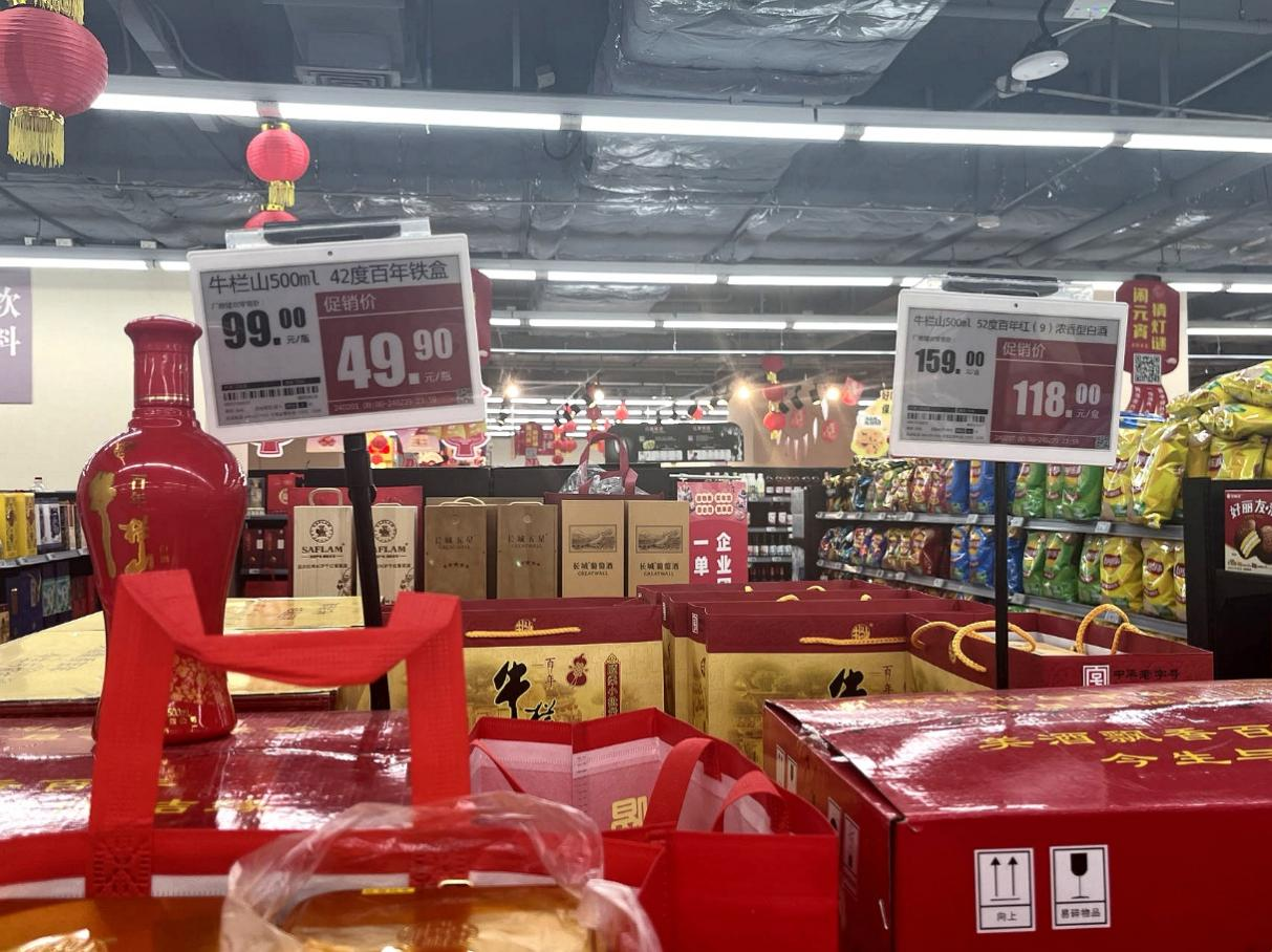 ??中高端名酒“熱辣滾燙”,但一些大眾酒及區(qū)域弱勢品牌卻在打折促銷。在北京西城區(qū)一家物美超市內(nèi),包括瀘州老窖、五糧液、紅星、牛欄山等旗下多款產(chǎn)品進(jìn)行不同程度促銷。牛欄山42度百年鐵盒500ml原價99元,促銷價49.9元,幾乎半價銷售,牛欄山52度百年紅500ml原價159元,促銷價118元,促銷折扣力度很大。瀘州老窖52度頭曲藍(lán)花瓷,廠商建議零售價398元,促銷價199元,原價基礎(chǔ)上打了對折;五糧液旗下品牌五糧尊是一款中檔酒,廠商建議零售價328元,促銷價168元,此外,超市還推出了“猜燈謎,贏五糧液”活動。