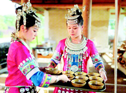 侗家姑娘正在給游客端上特色小吃