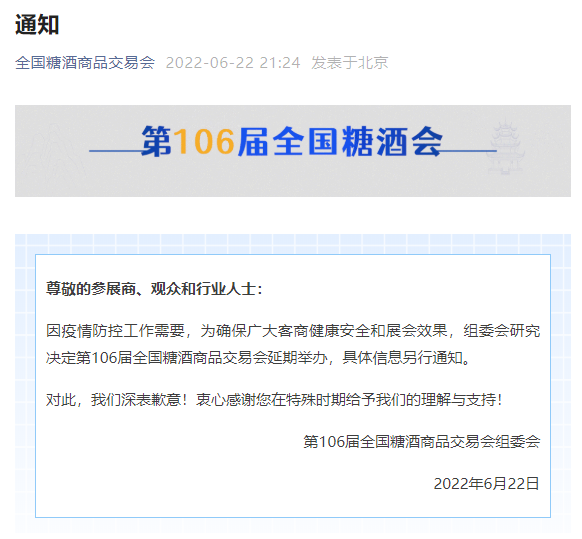 中國食品安全網(wǎng)訊(王靜)6月22日晚,全國糖酒商品交易會發(fā)布通知稱,因疫情防控工作需要,為確保廣大客商健康安全和展會效果,組委會研究決定第106屆全國糖酒商品交易會延期舉辦,具體信息另行通知。