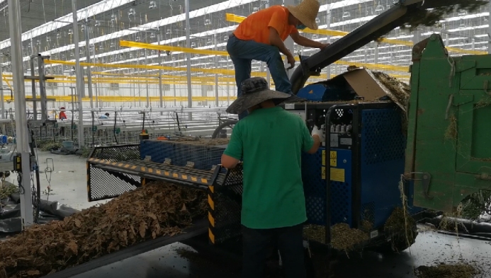 植株粉碎:由專業(yè)人員,操作粉碎機(jī)對植株殘體進(jìn)行粉碎,如圖3所示。粉碎后的植株殘體運(yùn)到溫室外進(jìn)行處理。