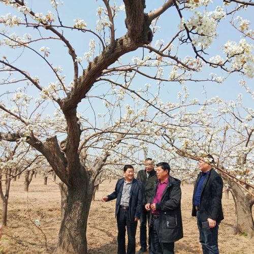 河北量子云河生物科技有限公司董事長(zhǎng)崔建文(左一)和趙縣秋振梨果種植專業(yè)合作社社長(zhǎng)張秋振(右二)在馬莊百年梨樹下觀看使用有機(jī)肥的效果