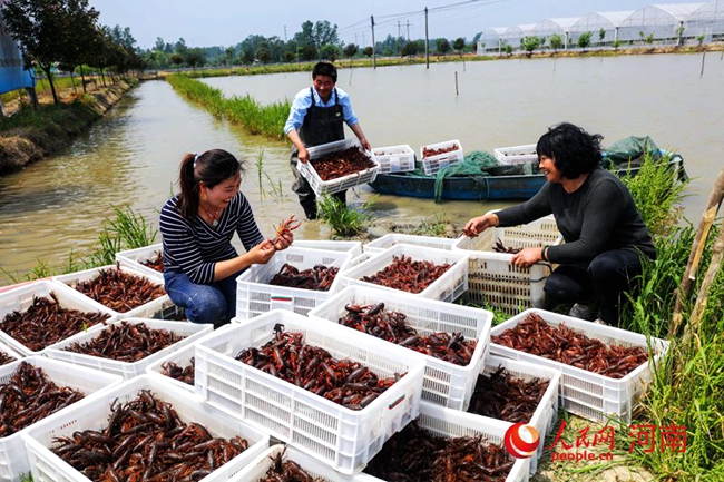 光山縣青龍河合作社社員正在稻田里捕獲小龍蝦