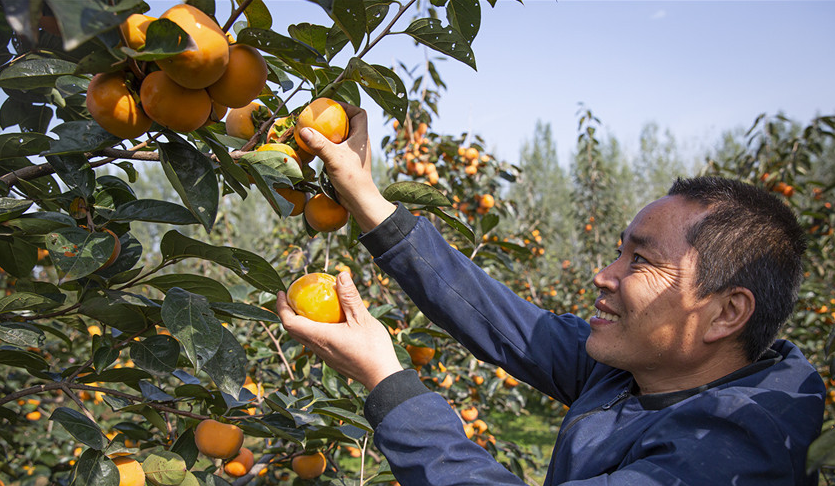 10月17日,在河南省魯山縣張良鎮(zhèn)紀營村耀偉甜柿基地,甜柿子掛滿枝頭,碩果累累。望著滿園子紅彤彤的甜柿,周耀偉心里美滋滋的。