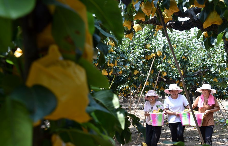 中國食品安全網(wǎng)訊(郝源)?7月30日,游客在劉楊莊村的梨園采摘。