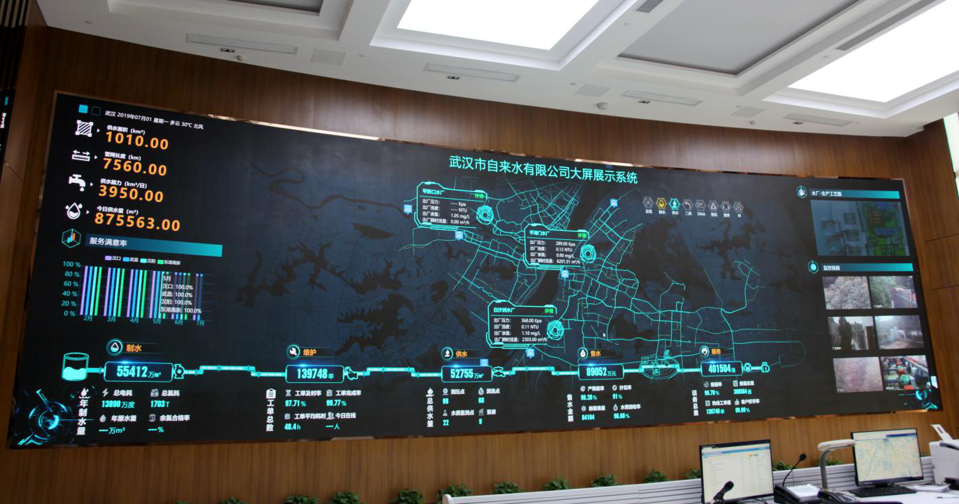 “這是我們打造的智慧水務(wù)的統(tǒng)一信息平臺(tái),各生產(chǎn)、服務(wù)環(huán)節(jié)情況一覽無(wú)余?!?月1日,武漢市水務(wù)集團(tuán)智慧水務(wù)中心負(fù)責(zé)人告訴到訪的記者,這塊LED顯示屏是6月30日才投入使用的,目前接入的系統(tǒng)只有制水和供水系統(tǒng),還有二供、DMA分區(qū)計(jì)量漏損控制、營(yíng)收、服務(wù)等系統(tǒng)將逐步接入。