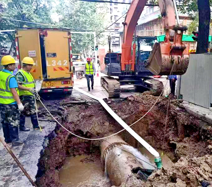 “應(yīng)急預(yù)案啟動(dòng),各工種人員均第一時(shí)間到達(dá)現(xiàn)場(chǎng),設(shè)備調(diào)配、車輛調(diào)度、交通疏導(dǎo),緊張有序的迅速展開(kāi)?!睋屝蕃F(xiàn)場(chǎng)負(fù)責(zé)人說(shuō)道,技術(shù)人員發(fā)現(xiàn),管道漏水處情況較為復(fù)雜,一是塌陷面積較大,增加了施工難度;二是該路段屬于老城區(qū),破管上方有電纜,挖掘機(jī)臂膀無(wú)法伸展,必要時(shí)只能采取人工開(kāi)挖,以確保安全。按照經(jīng)驗(yàn)和常規(guī)操作,預(yù)計(jì)次日凌晨2時(shí)左右搶修完畢恢復(fù)供水。