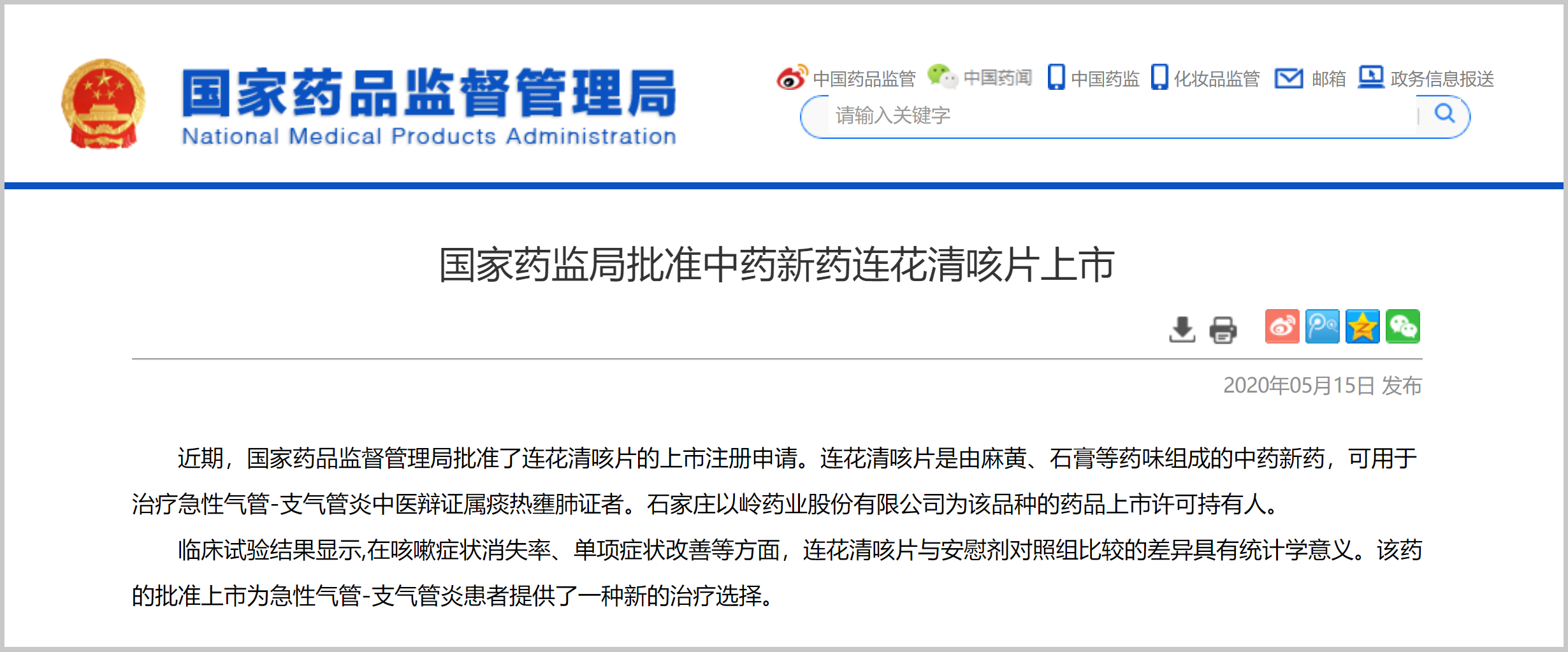 中國(guó)食品安全網(wǎng)訊(熊源?黃松?記者胡毅)5月18日,記者獲悉,5月17日晚,國(guó)家藥品監(jiān)督管理局核準(zhǔn)簽發(fā)的《藥品注冊(cè)批件》公告顯示,石家莊以嶺藥業(yè)股份有限公司(簡(jiǎn)稱"以嶺藥業(yè)")申報(bào)的中藥新藥連花清咳片獲得。公告顯示,根據(jù)《中華人民共和國(guó)藥品管理法》,經(jīng)審查,連花清咳片符合新藥審批的有關(guān)規(guī)定,批準(zhǔn)生產(chǎn),藥品注冊(cè)批件號(hào)為2020S00253,藥品標(biāo)準(zhǔn)文號(hào)為國(guó)藥準(zhǔn)字Z20200004。