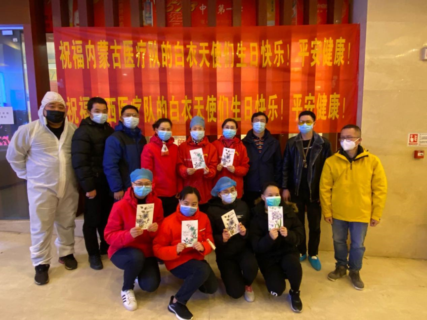 醫(yī)護隊里有?7?名隊員的生日是?2?月?20?日。當天,當醫(yī)護人員結(jié)束輪班回到酒店時,突然出現(xiàn)的生日蛋糕、生日賀卡和生日橫幅,讓所有醫(yī)護隊員驚喜不已。