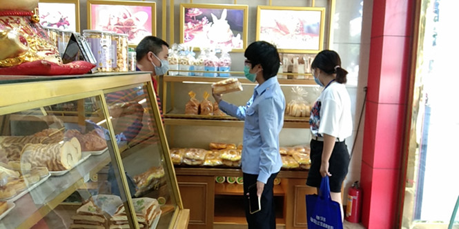 執(zhí)法人員檢查糕點(diǎn)店所銷(xiāo)售的食品