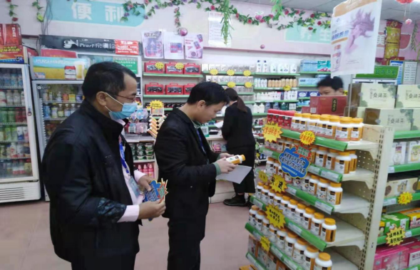 市場(chǎng)監(jiān)管人員檢查藥店保健食品標(biāo)簽情況