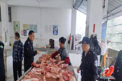 執(zhí)法人員到七坊鎮(zhèn)對生鮮豬肉攤點進行突擊檢查