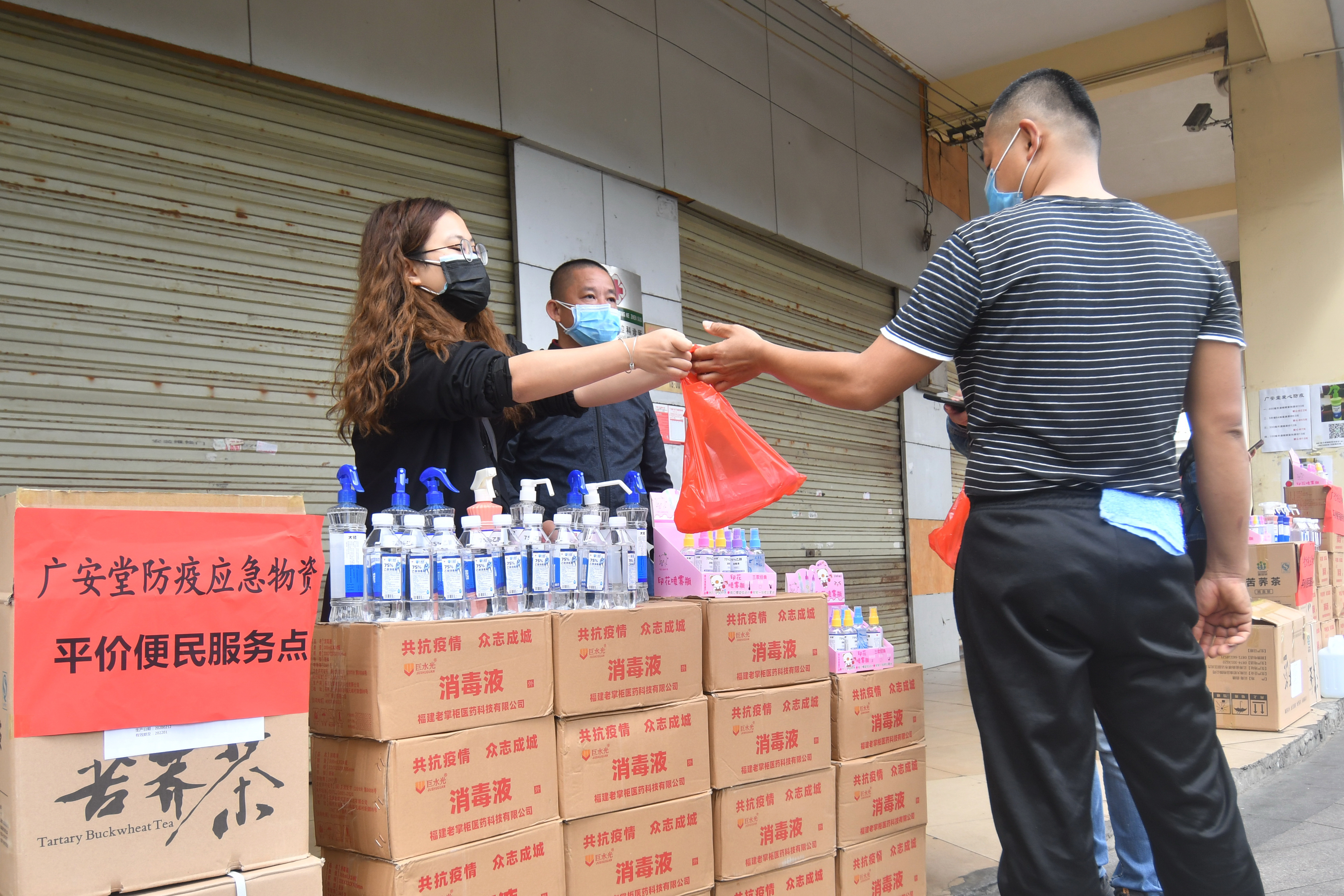 市民在廣安堂防疫應(yīng)急物資平價(jià)便民服務(wù)點(diǎn)購(gòu)買酒精