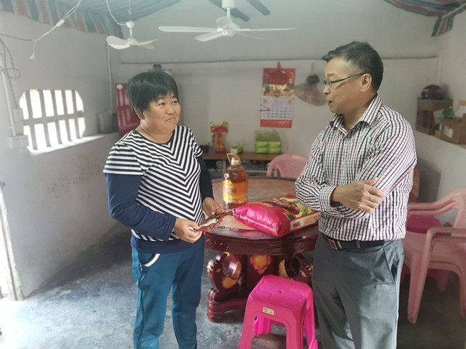 海墾茶業(yè)集團(tuán)黨委書記董事長(zhǎng)蔡錦源(右)到白馬嶺茶業(yè)公司2隊(duì)慰問困難黨員馮艷(左)