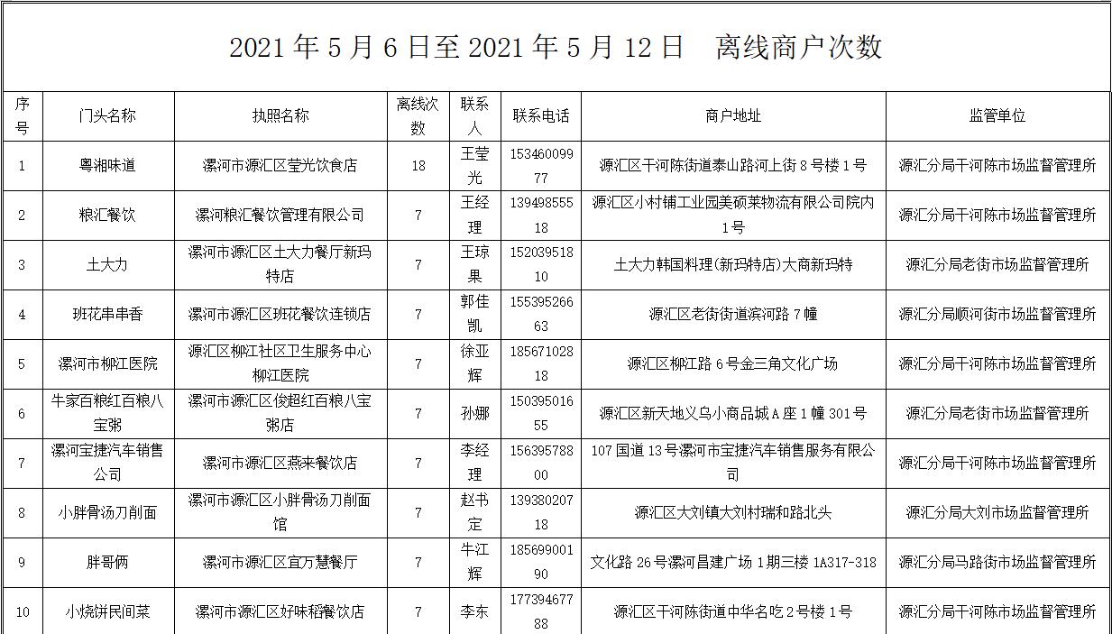 中國食品安全網(wǎng)訊(宋曉明) 近日,在“互聯(lián)網(wǎng)+明廚亮灶”智慧監(jiān)管實施的過程中,部分餐飲經(jīng)營者,無視所在轄區(qū)市場監(jiān)管所執(zhí)法人員勸誡,多次出現(xiàn)對“互聯(lián)網(wǎng)+明廚亮灶”監(jiān)管攝像頭進行拔線、斷網(wǎng)、斷電行為,無故脫離智能監(jiān)管,擾亂了“互聯(lián)網(wǎng)+明廚亮灶”食品安全監(jiān)管秩序,特對以下餐飲經(jīng)營者予以公開曝光,下調這些餐飲店食品安全等級,同時要求以下餐飲經(jīng)營者2021年5月14日前到漯河市市場監(jiān)管局源匯分局食品股310室說明情況(電話:2189892),接受進一步處理。