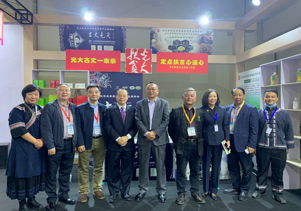 中國(guó)光大集團(tuán)扶貧辦主任趙保富(左五),上海光大會(huì)展中心黨委書記、總經(jīng)理劉憲民(左四),古丈縣委常委、副縣長(zhǎng)秦綱(左二)等領(lǐng)導(dǎo)與古丈縣參展企業(yè)代表在一起。