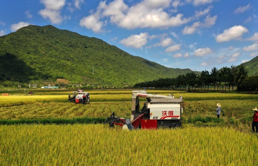 5月9日上午,湖南省雜交水稻研究中心海南省三亞市海棠灣基地,收割機(jī)對水稻試驗示范田進(jìn)行收割測產(chǎn)。