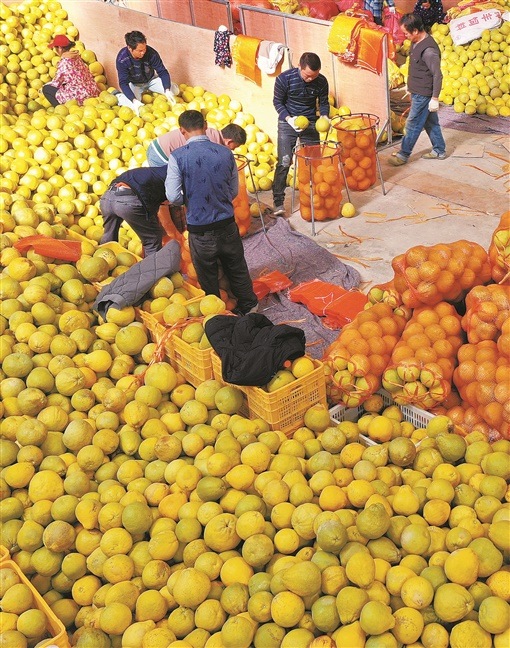 江永縣粗石江鎮(zhèn)香柚產(chǎn)業(yè)園加工車間,工人在袋裝香柚。近年來,當(dāng)?shù)卮罅ε嘤浴敖老汨帧睘橹鞯奶厣a(chǎn)業(yè),種植面積達13.8萬畝,今年香柚產(chǎn)量預(yù)計可達10萬噸以上,村民通過發(fā)展香柚產(chǎn)業(yè)實現(xiàn)增收致富。(蔣克青?田如瑞)