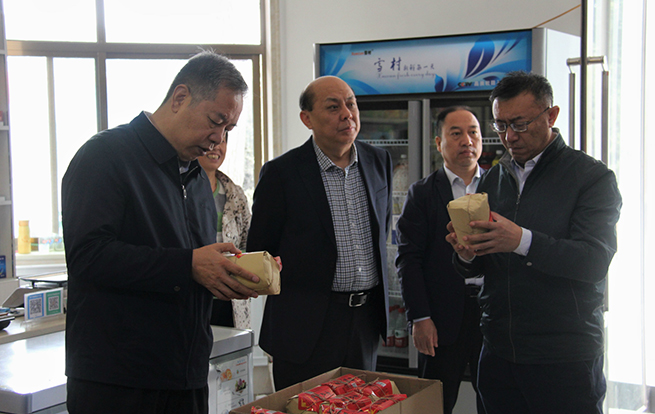山西省市場監(jiān)管局黨組成員、副局長王德立與臨汾市市場監(jiān)管局副局長衛(wèi)浩靜在隰縣檢查農(nóng)村過期食品整治工作。