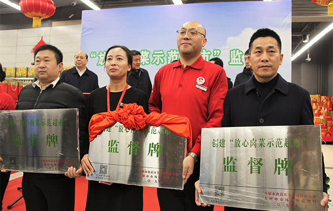 1月10日,美特好興華街店、迎澤西大街店、濱河購(gòu)物廣場(chǎng),沃爾瑪長(zhǎng)風(fēng)街店,太原王府井,永輝超市迎澤分公司等6家超市負(fù)責(zé)人從太原市副市長(zhǎng)王愛琴手中接過了創(chuàng)建“放心肉菜示范超市”監(jiān)督牌。