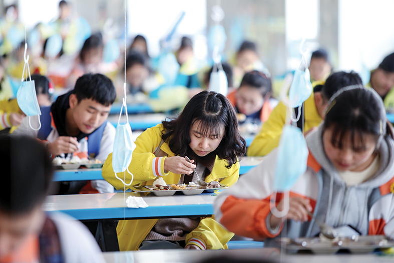 中國(guó)食品安全報(bào)訊?近日,貴州省遵義市湄潭縣求是高級(jí)中學(xué)高三年級(jí)迎來(lái)開(kāi)學(xué),該學(xué)校在開(kāi)學(xué)前期成立疫情防控工作組,制定“疫情防控一校一策”、編印《新冠肺炎疫情防控手冊(cè)》,按照師生體溫一日三檢、實(shí)行五天一輪的作息時(shí)間、“錯(cuò)峰、定點(diǎn)、定員、定時(shí)、定向”的原則安排師生用餐、做好通風(fēng)消殺等制度,確保疫情防控和教育教學(xué)兩不誤。貴州省內(nèi)各中學(xué)初三高三年級(jí)已于3月16日全面開(kāi)學(xué)復(fù)課。 瞿宏倫 攝
